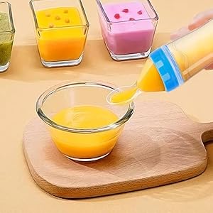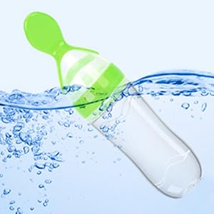 Fill the silicone bottle with puree or liquid food. Squeeze the body gently to push food out through the spoon tip. Feed directly to your baby, and clean it easily with warm water afterward. Dishwasher safe.